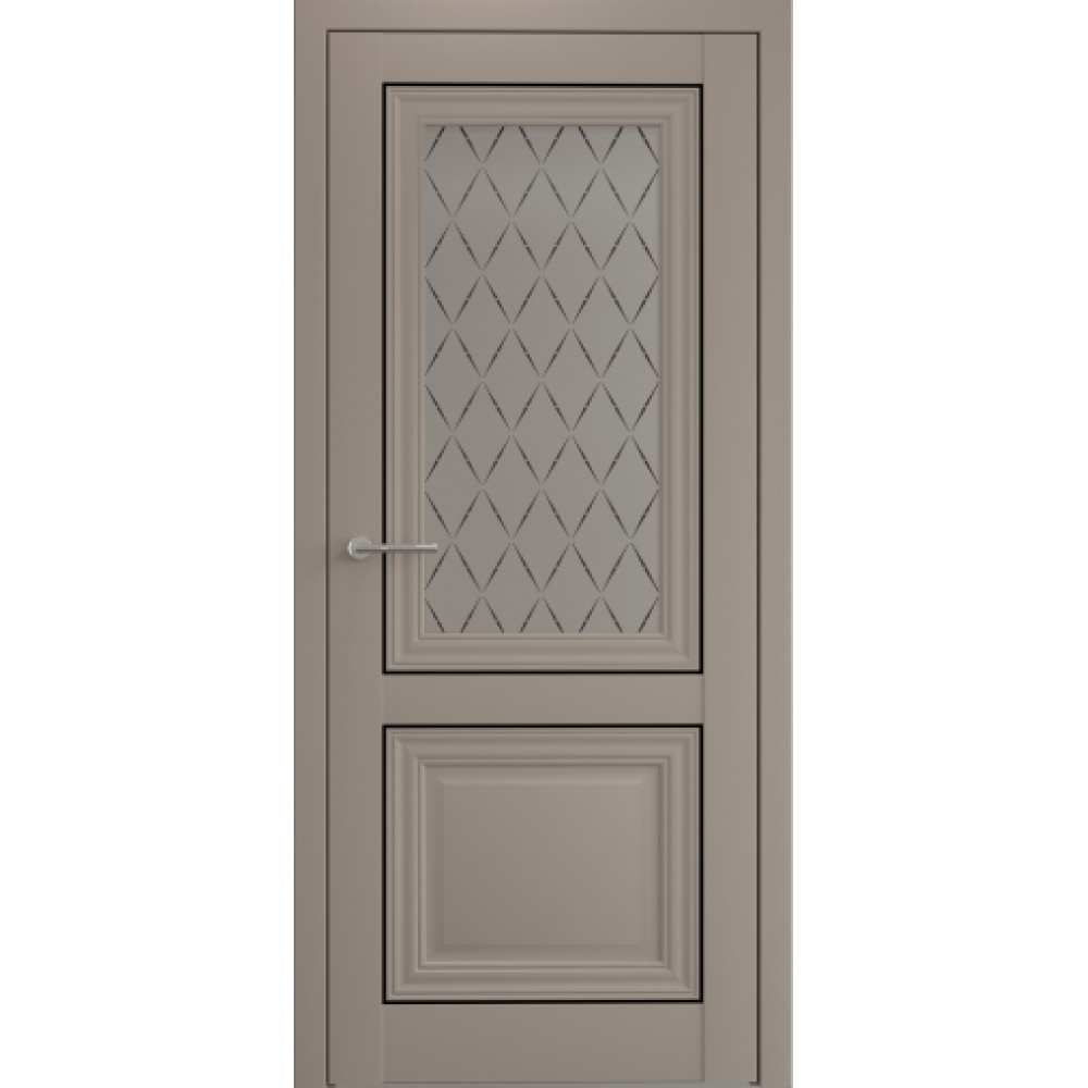 Царговое полотно из коллекции «Империя» выделяется классическим дизайном, а также типом покрытия Vinyl и стеклом с художественным рисунком «Ромб». В коллекции также представлены двери с глухим полотном.