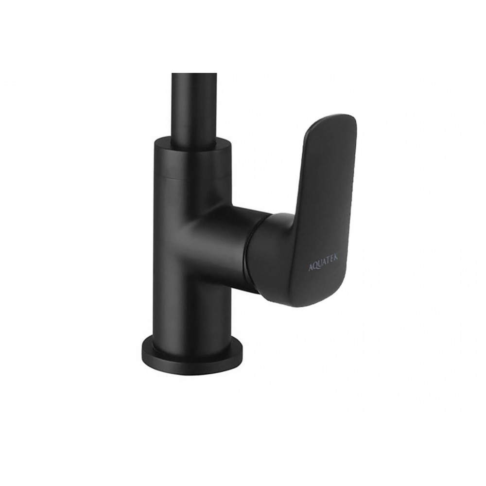 Смеситель для кухни AQUATEK Вега AQ1081MB однорычажный черный матовый оснащен высоким изливом, удобен для мытья крупных предметов. Однорычажная система регулировки силы струи и температуры воды. Цельный корпус смесителя снижает вероятность протечек. Оптимальная длинна подводки.